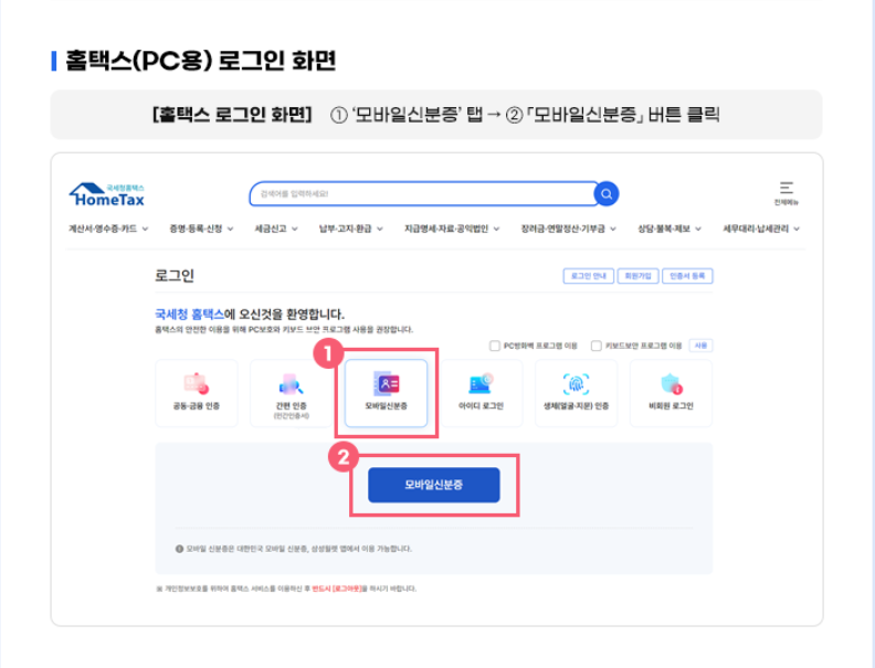 - 홈택스 접속 → 로그인 → ‘모바일 신분증 인증’ 선택